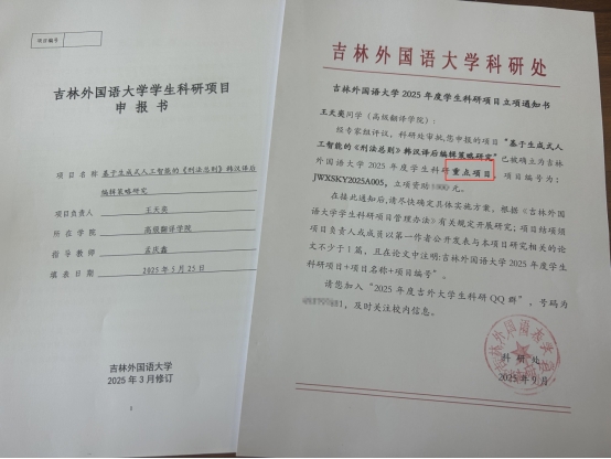 功夫不负有心人,我成功立项2024年吉林省高教学会课题《人机协同模式下吉林省涉外法规规章汉韩译后编辑策略研究》,还主持了《基于生成式人工智能的〈刑法总则〉韩汉译后编辑策略研究》《中韩法律文献翻译与跨境法律问题咨政》两项校级科研项目。这些课题紧跟法律翻译前沿,融入人工智能技术最新趋势,既搭建理论框架,又考量实践价值,满满的综合性与创新性,让我在科研中收获满满。