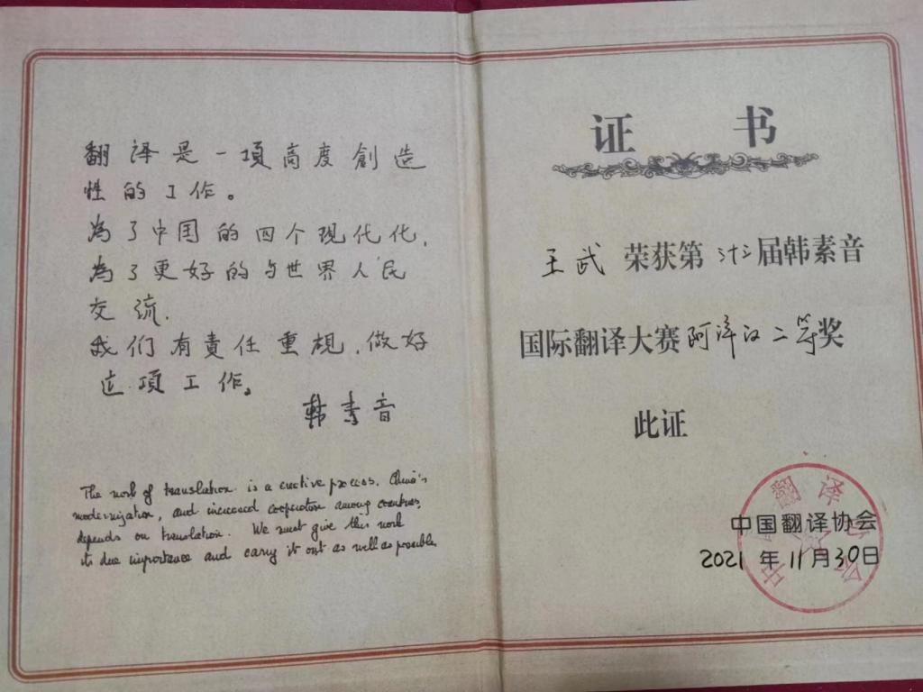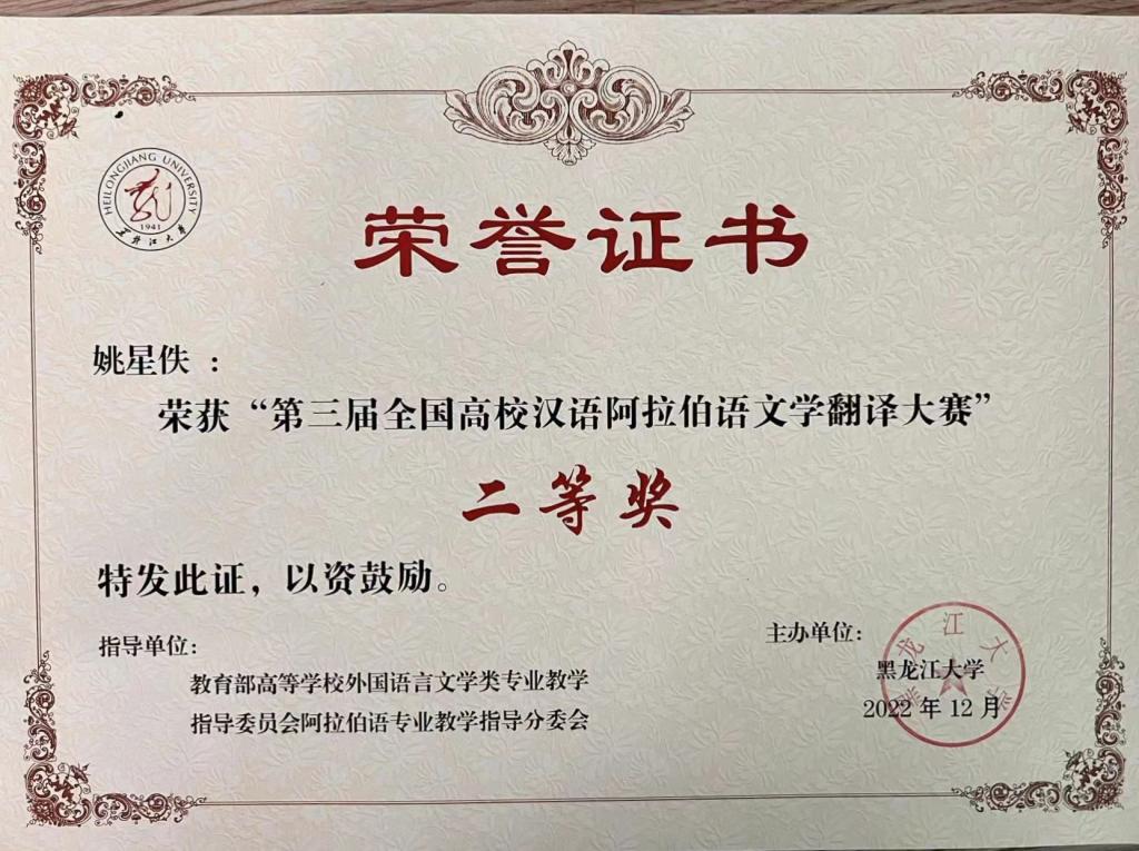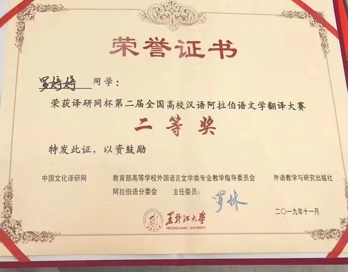 研究生在韩素音国际翻译大赛,全国高校汉语阿拉伯语文学翻译大赛等学科竞赛中获各类奖项20余项。