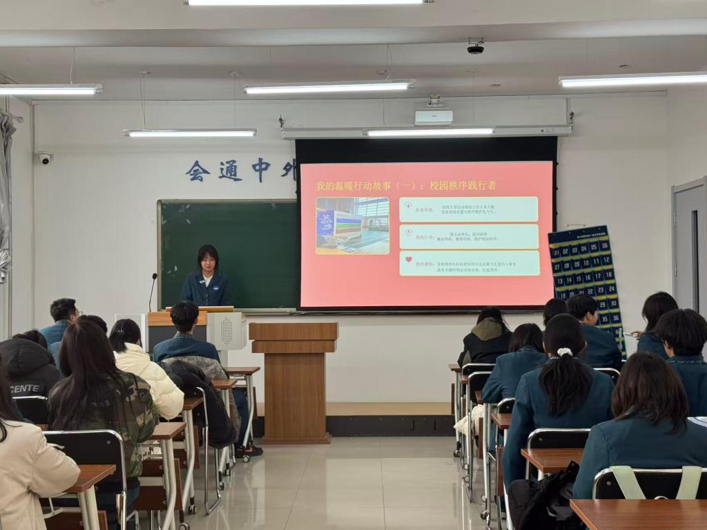 在雷锋精神分享会上,日语2401班吴莹以亲身经历为笔,勾勒出新时代青年践行雷锋精神的鲜活模样,让这份跨越时光的精神力量在分享中传递、在心底扎根。校园大型活动现场,她主动牵头、扛起责任,带领同学搬运物资、维护秩序,用挺身而出的担当,让雷锋精神藏在校园服务的点滴细节里;医院志愿岗位上,她耐心引导就诊、贴心帮扶患者,用真诚的付出,让雷锋精神暖在医患相伴的温情瞬间中;社区关爱行动里,她定期探访空巢老人,打扫房间、陪聊解闷、教用手机,用持久的善意,让雷锋精神落在敬老爱老的实际行动上。这些看似平凡的小事,没有惊天动地的壮举,却正是雷锋精神最真实的诠释——是遇事敢扛的责任,是真心实意的付出,是不求回报的奉献。